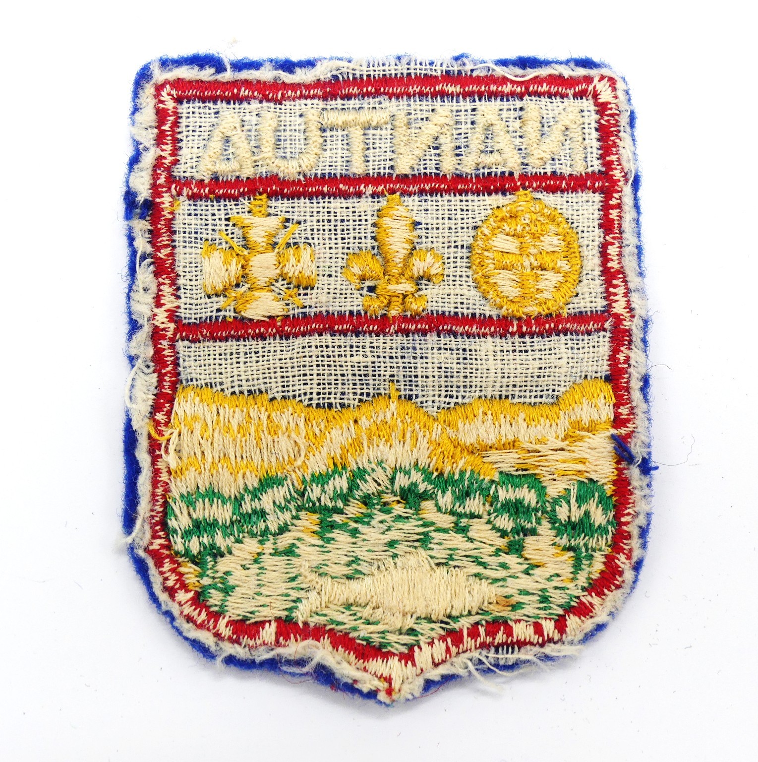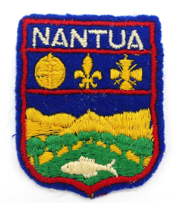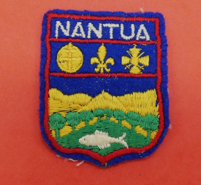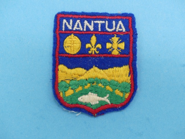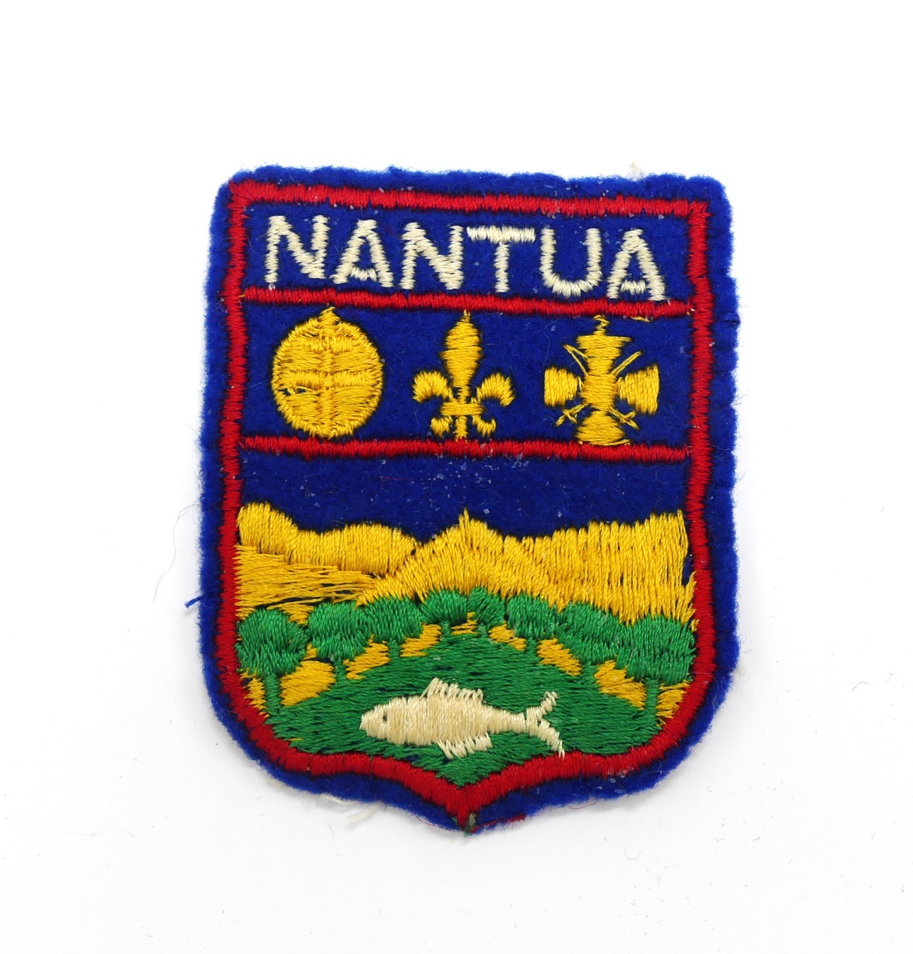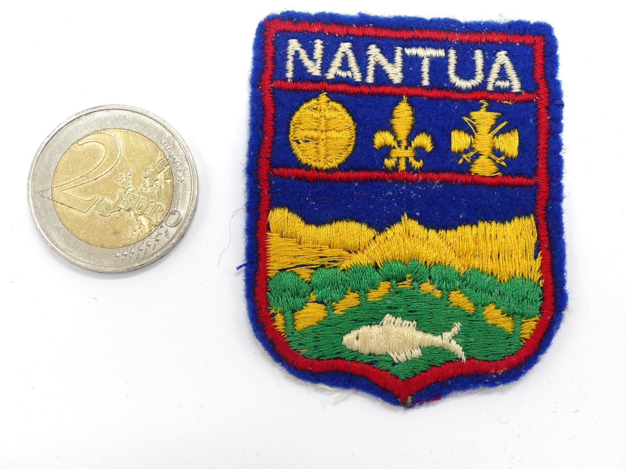 écusson brodé ville Nantua en tissu feutrine bleu et multicolore .