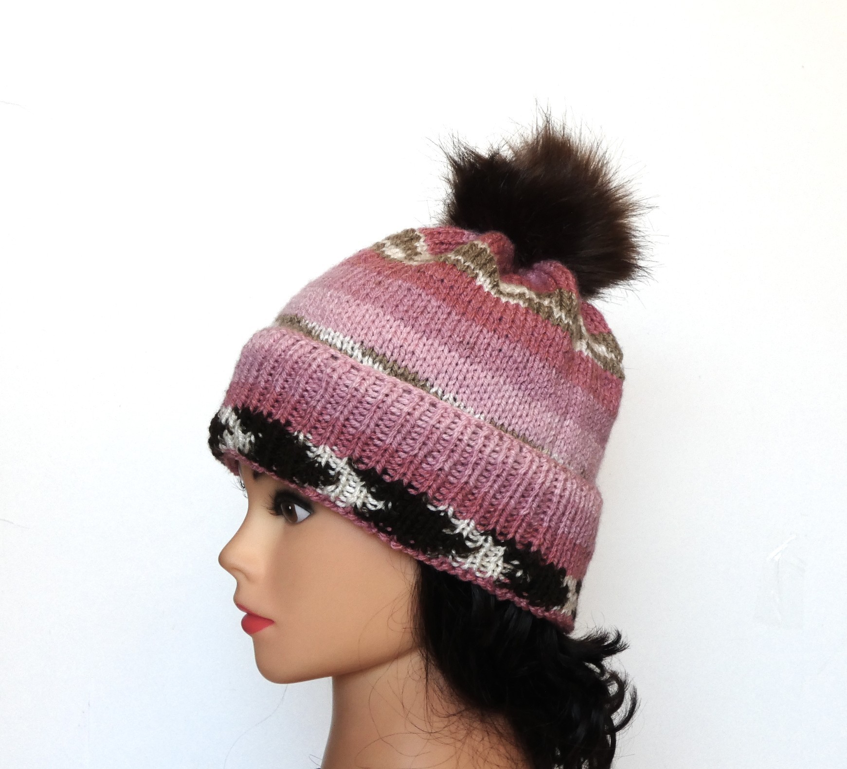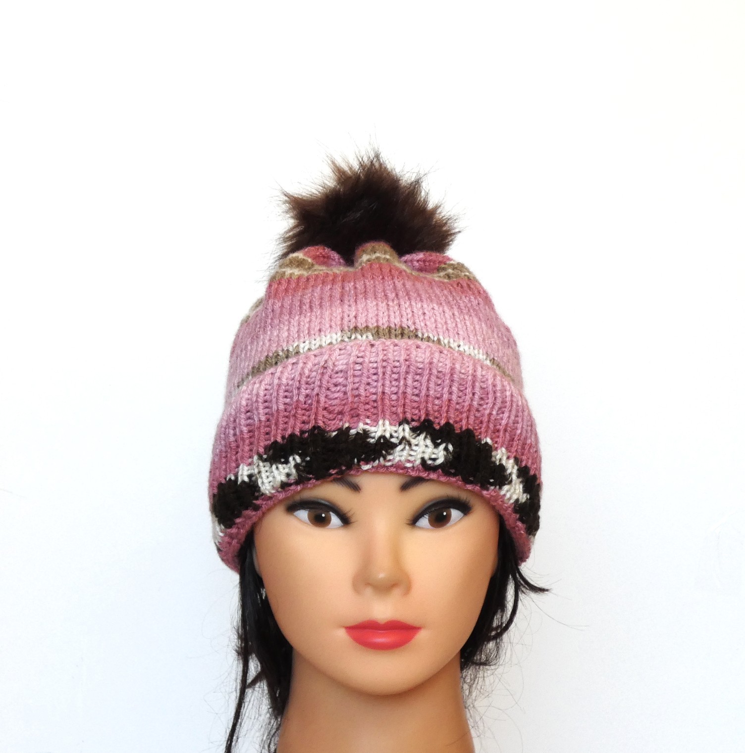 Bonnet femme rose, marron et blanc tricoté main avec pompon fourrure .