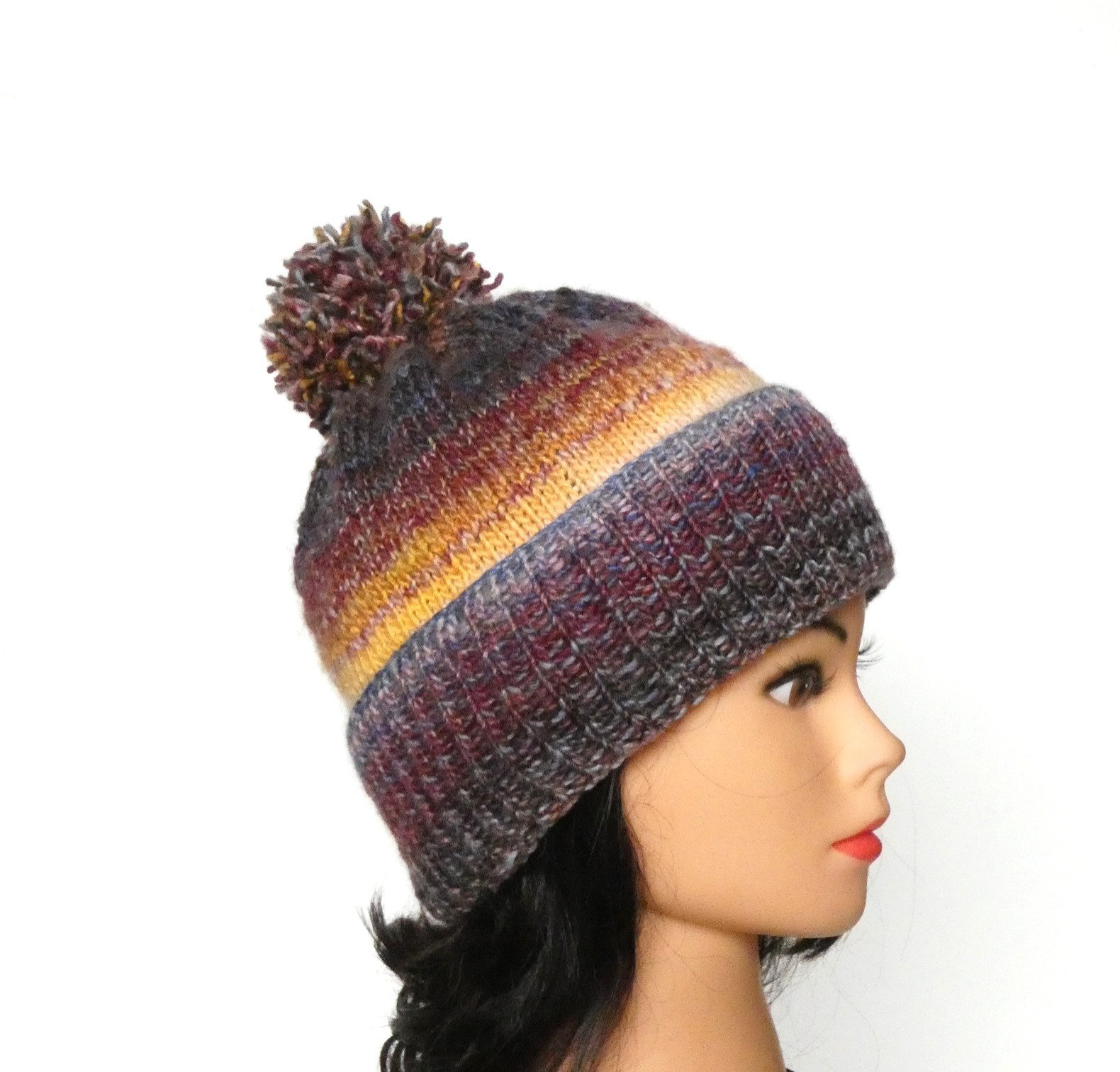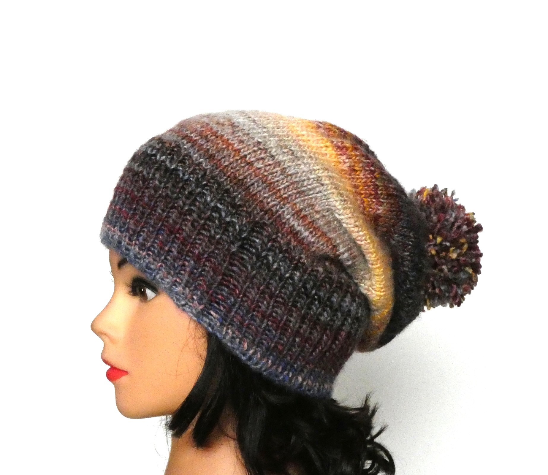 Bonnet loose long multicolore tricoté main avec ponpom .