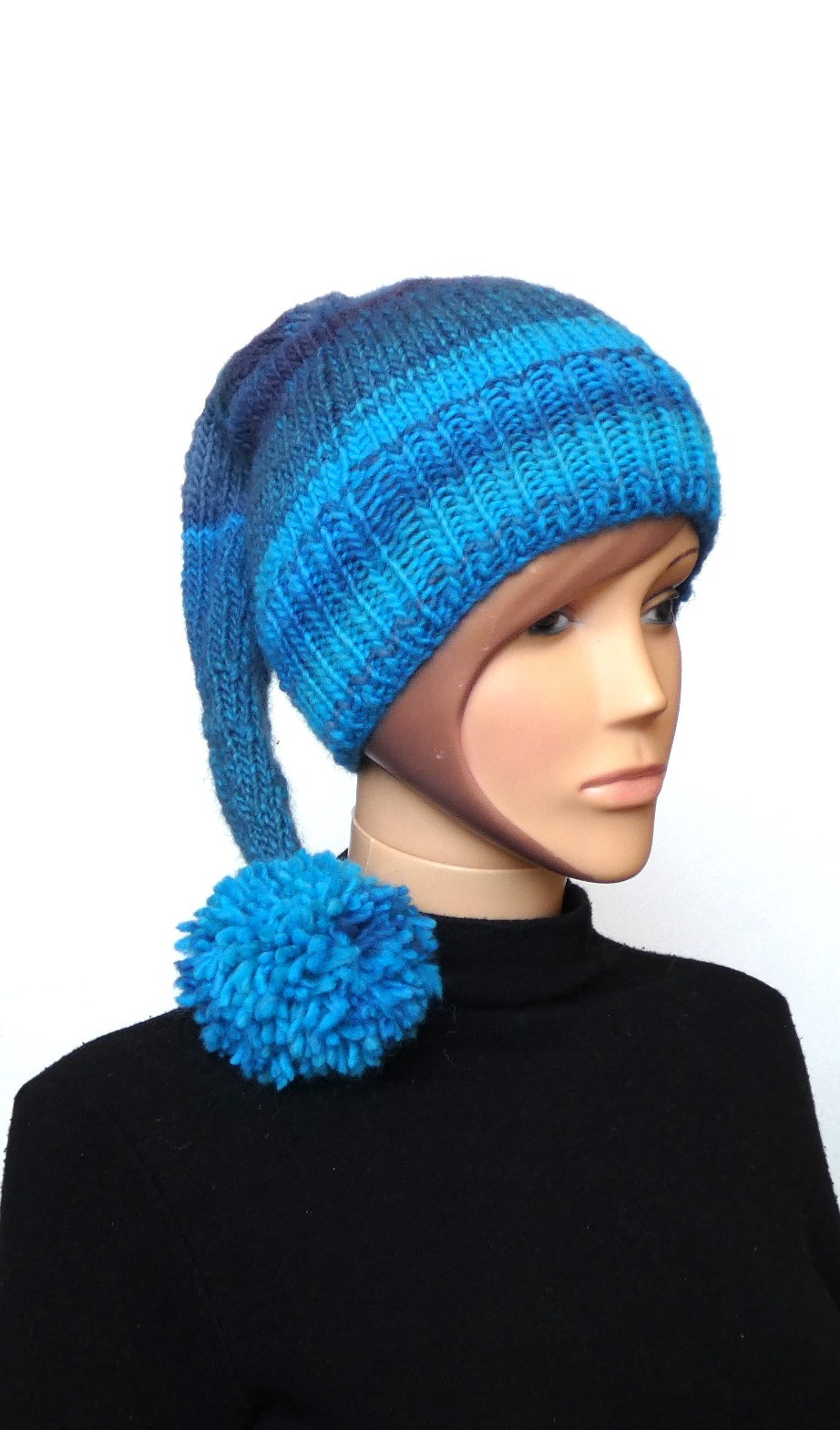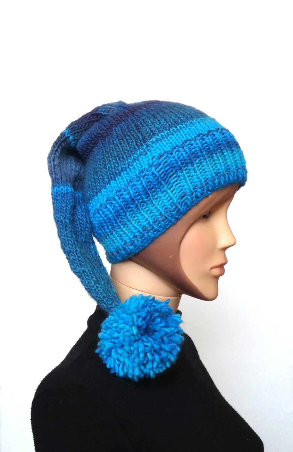 Joli bonnet lutin en laine bleu et turquoise avec pompon tricoté main .