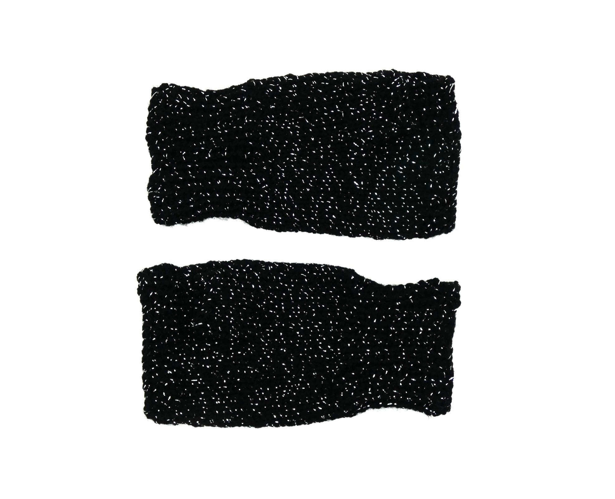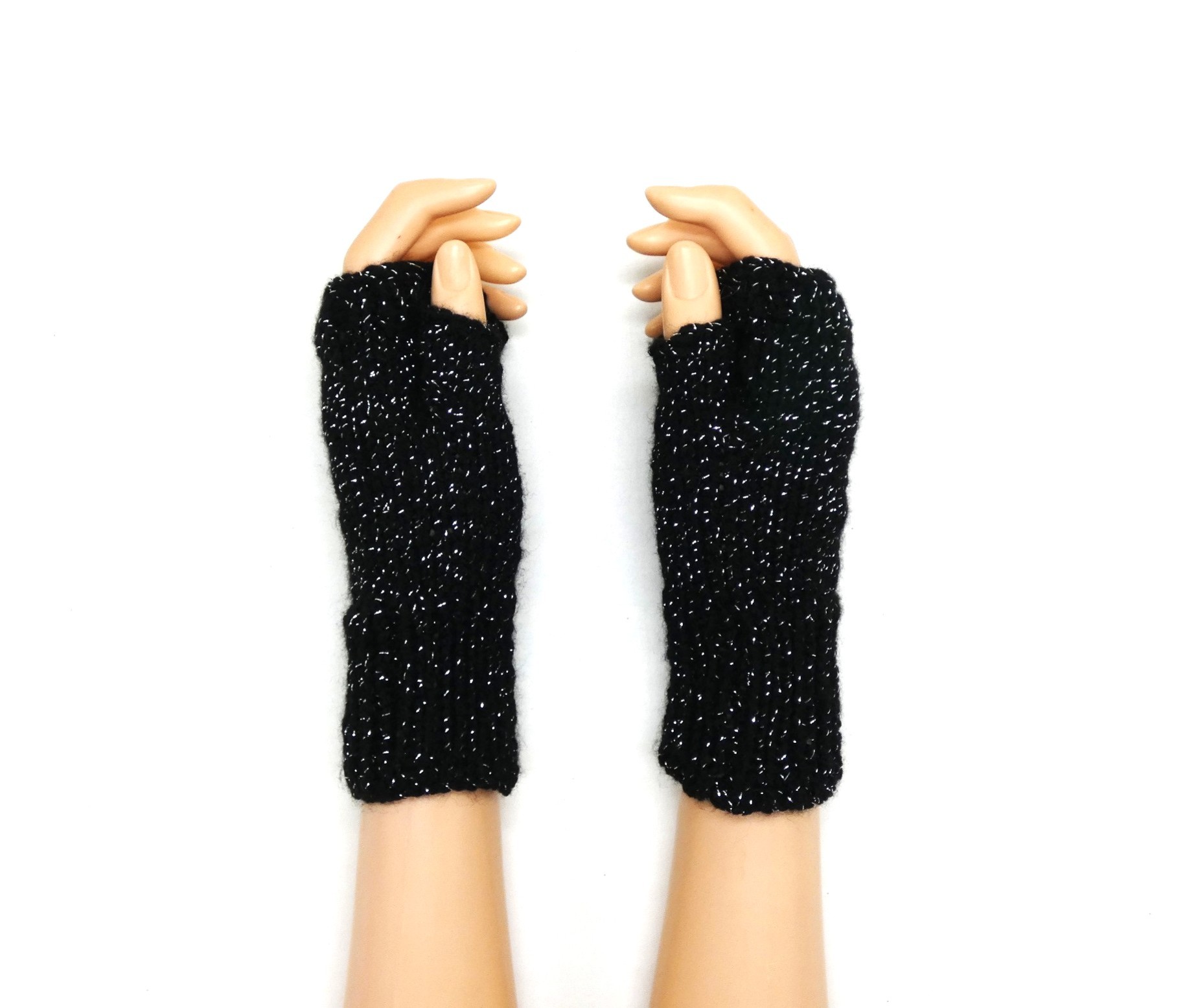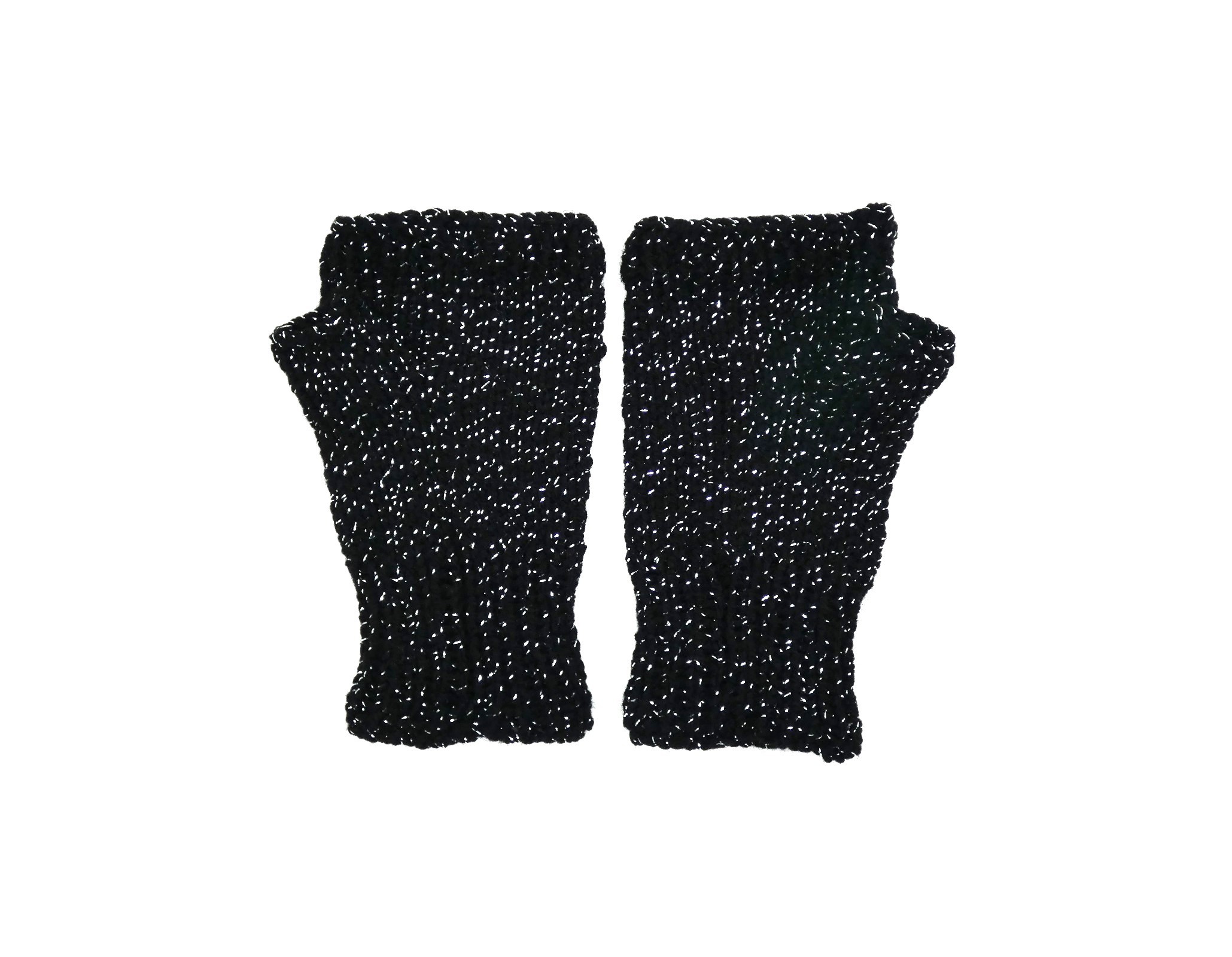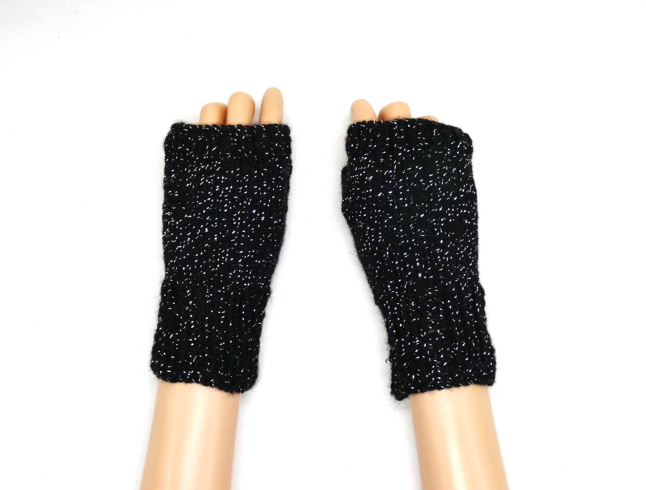 Mitaines pour femme noire pailletée argentée tricoté main.