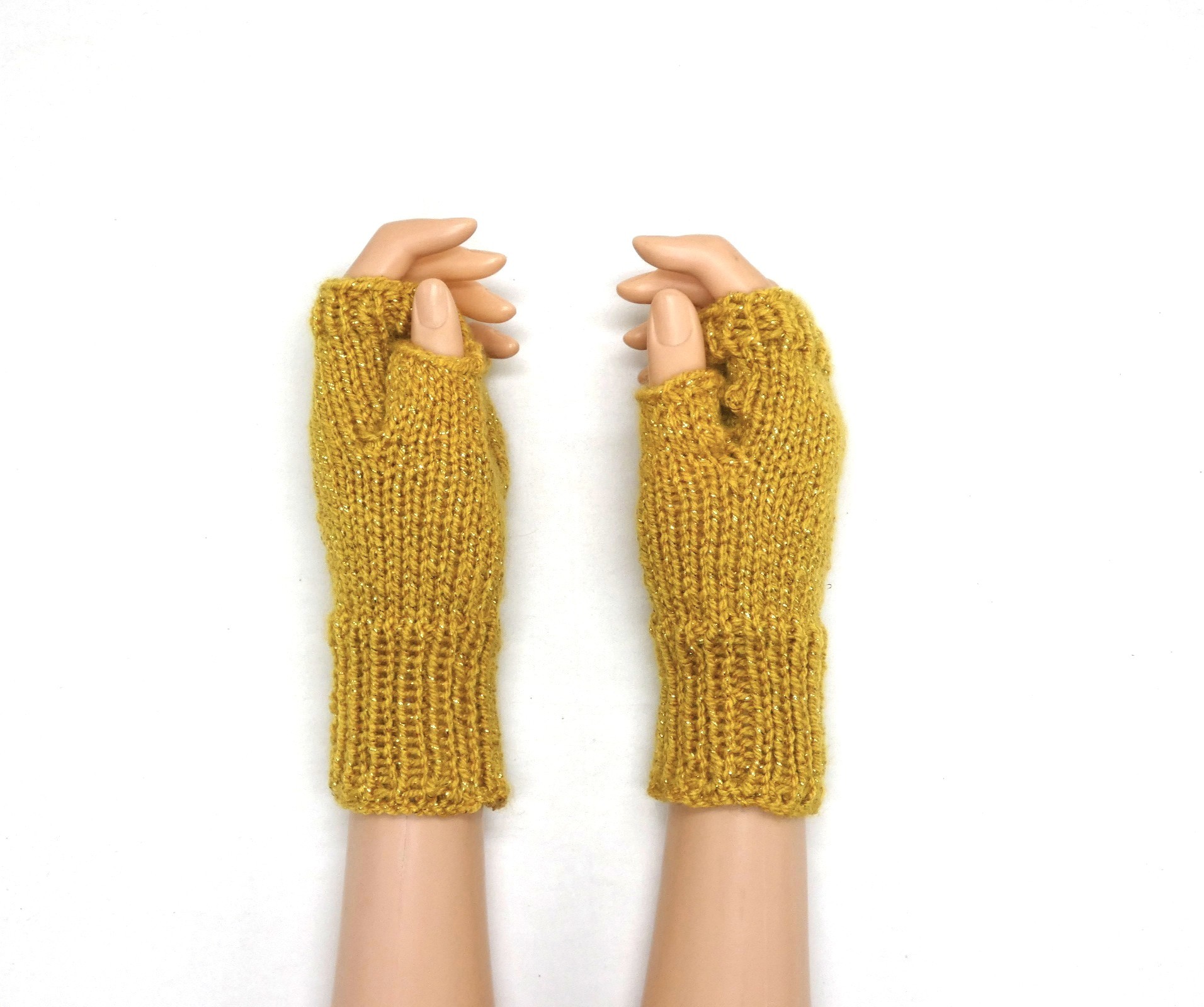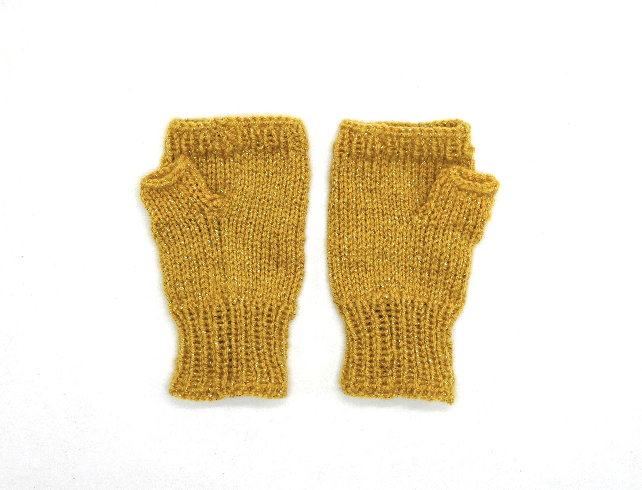 Mitaines pour femme jaune safran pailletée avec pouce tricoté main .