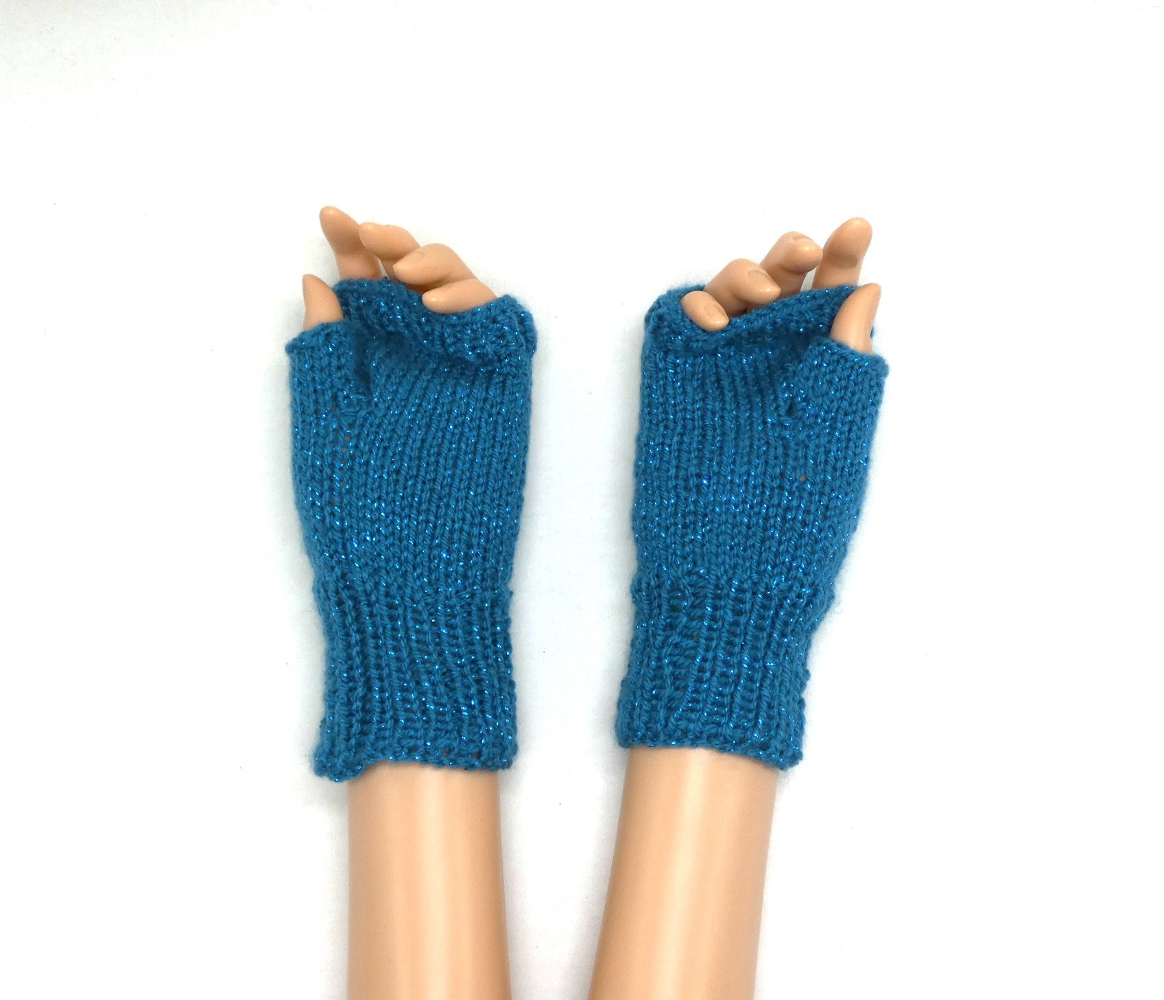 Mitaines pour femme bleu turquoise pailletée avec pouce tricoté main .