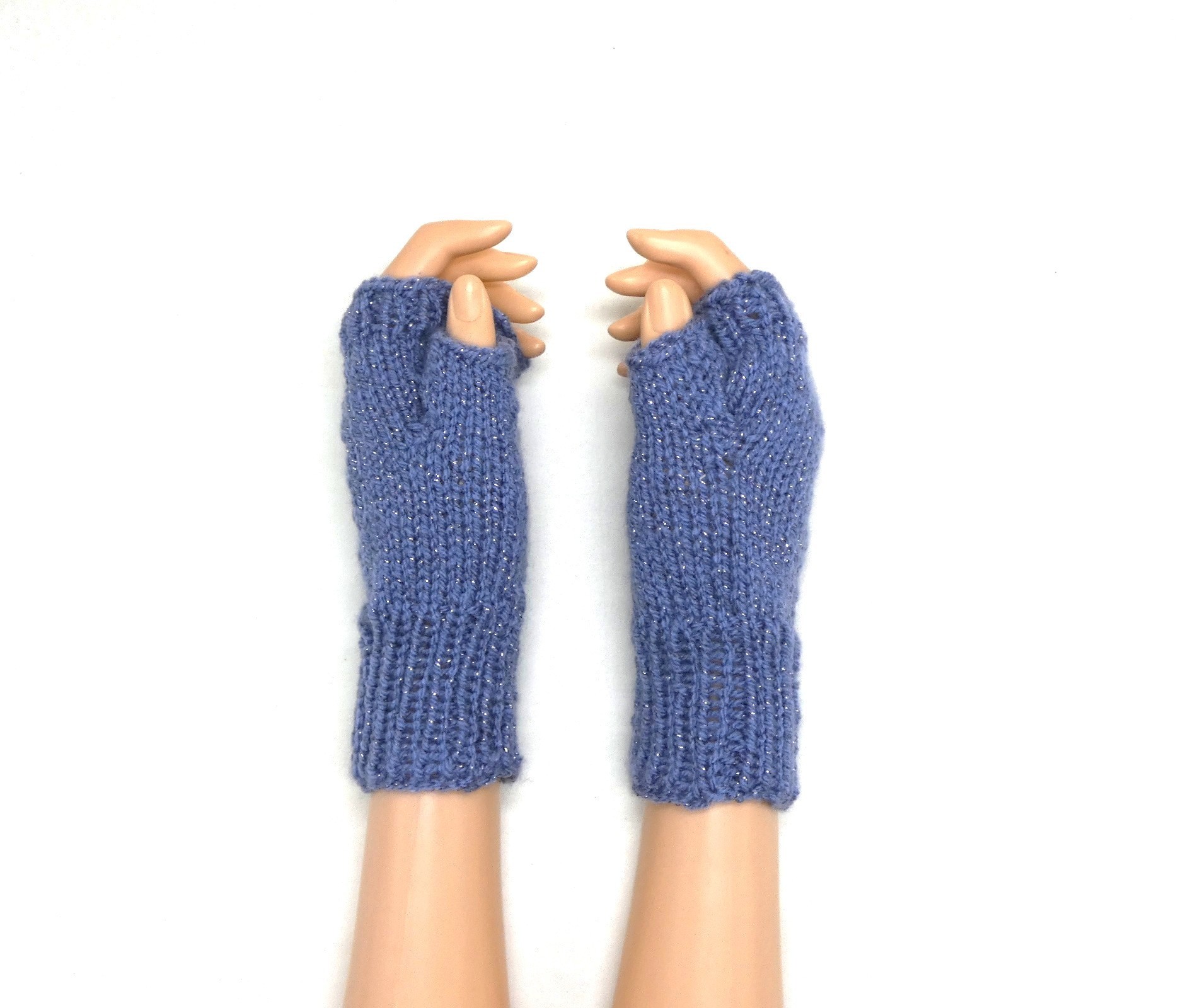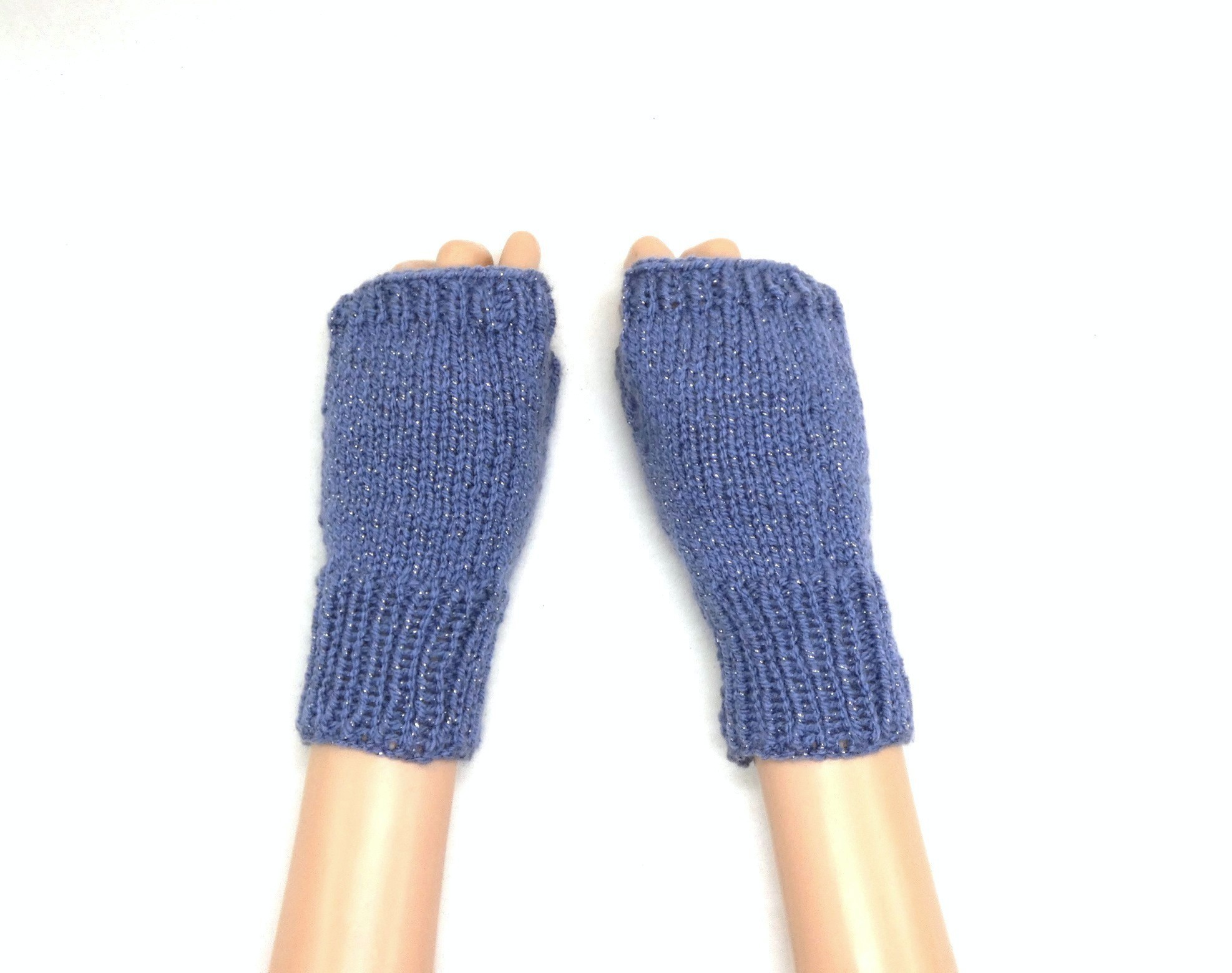 Mitaines bleu jean pailleté gris argenté avec pouces tricotées main.