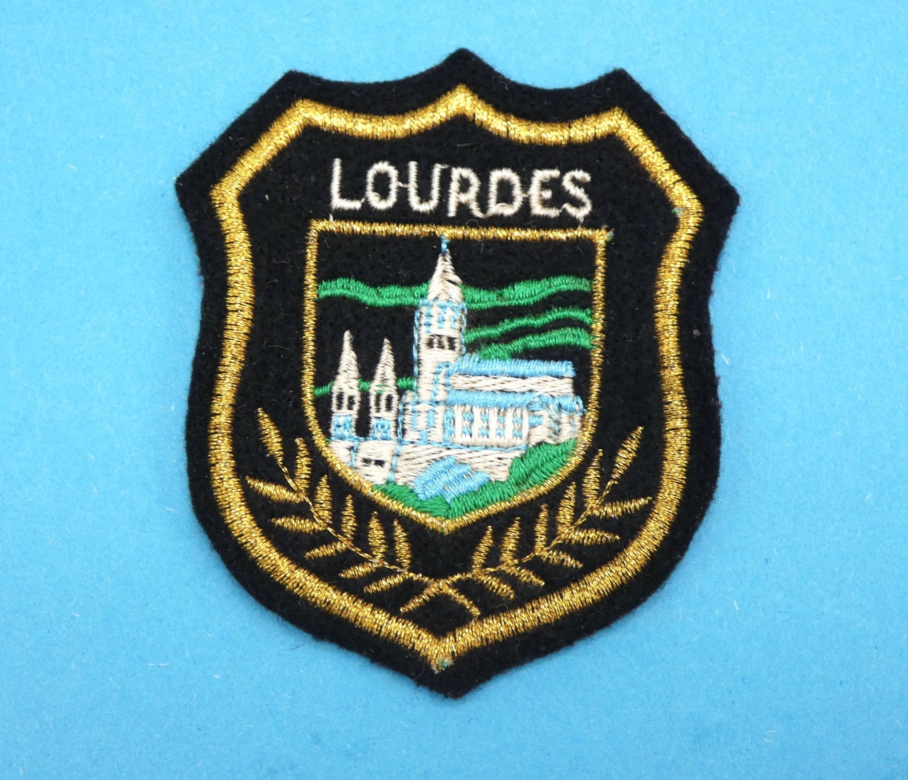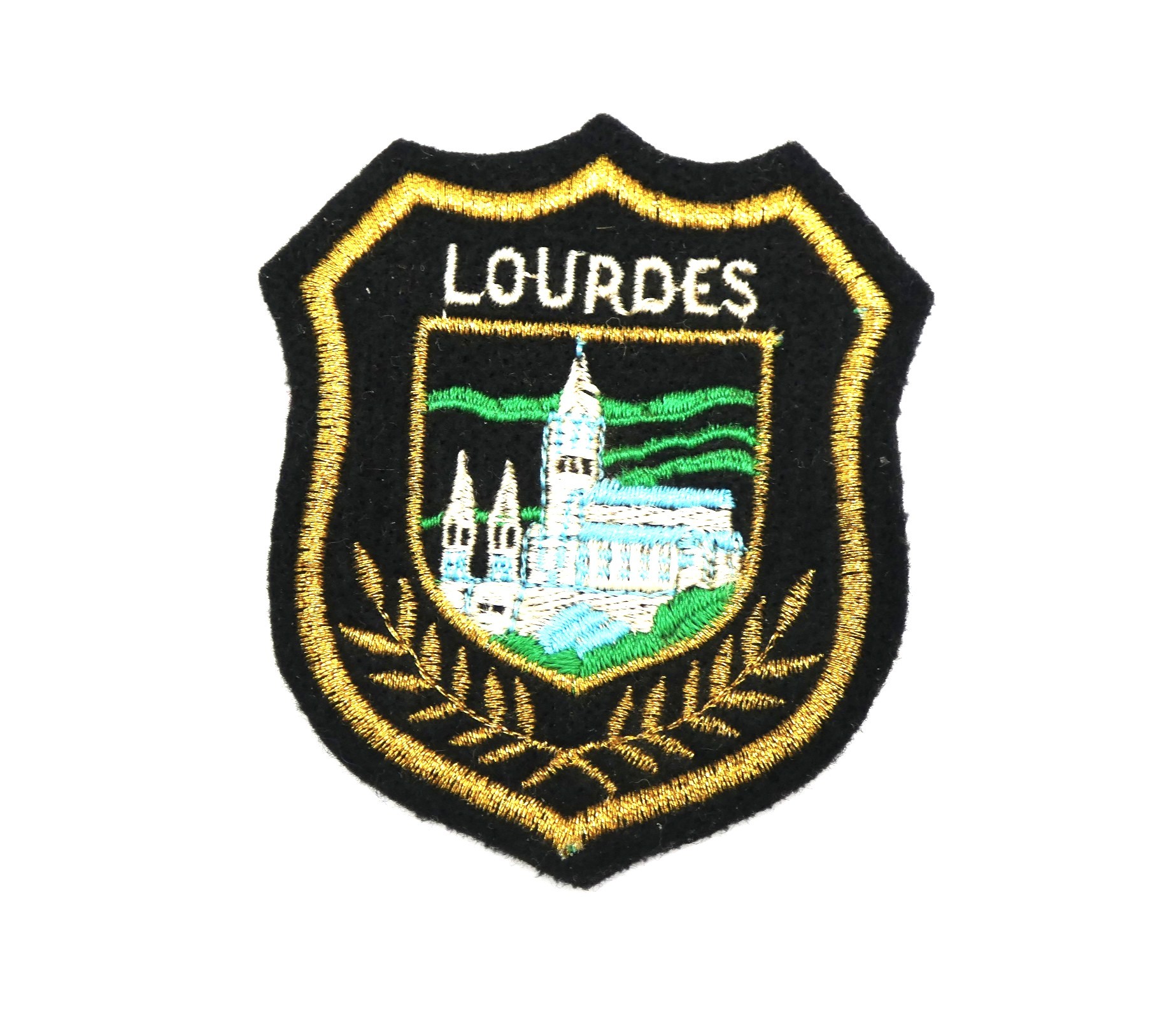 Beau blason en tissu feutrine, brodé ville Lourdes,