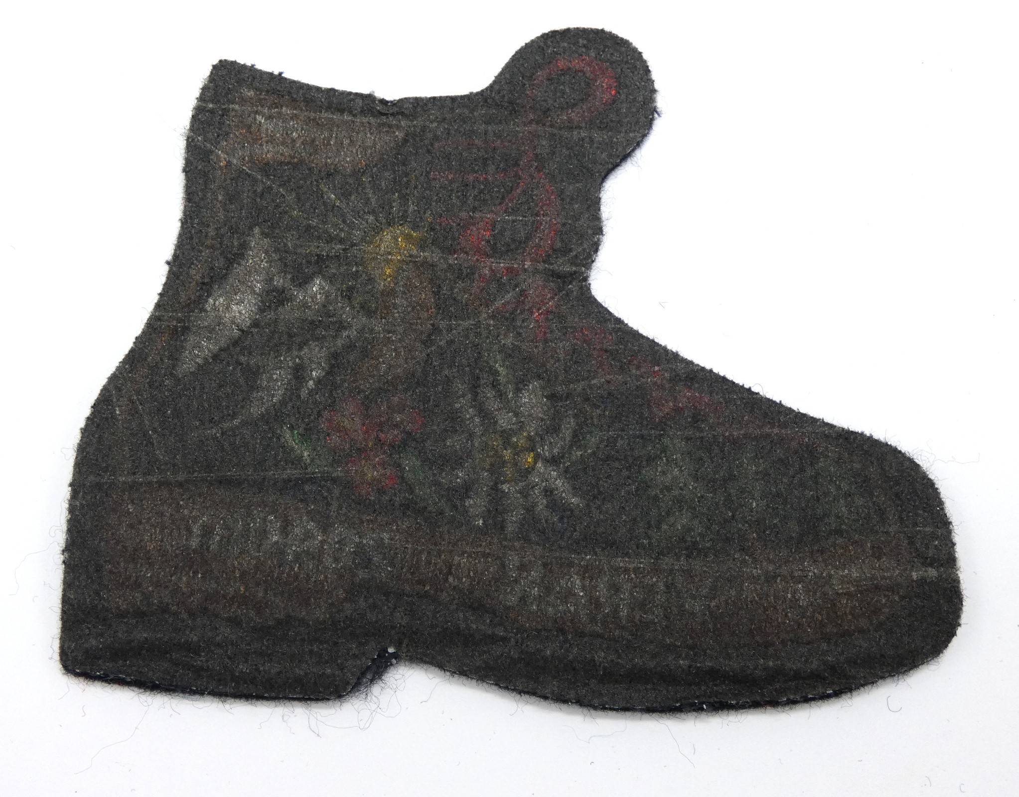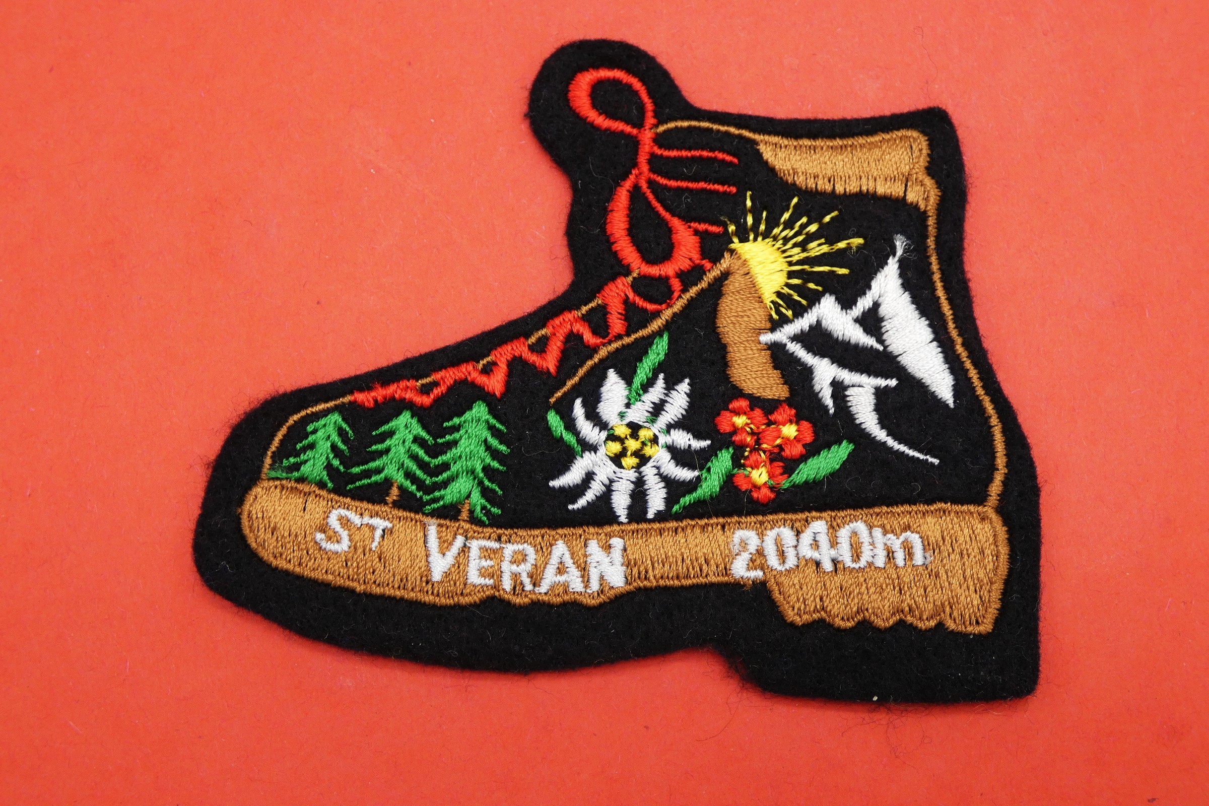 Ecusson St Veran en forme de chaussure de randonnée de maontagne,