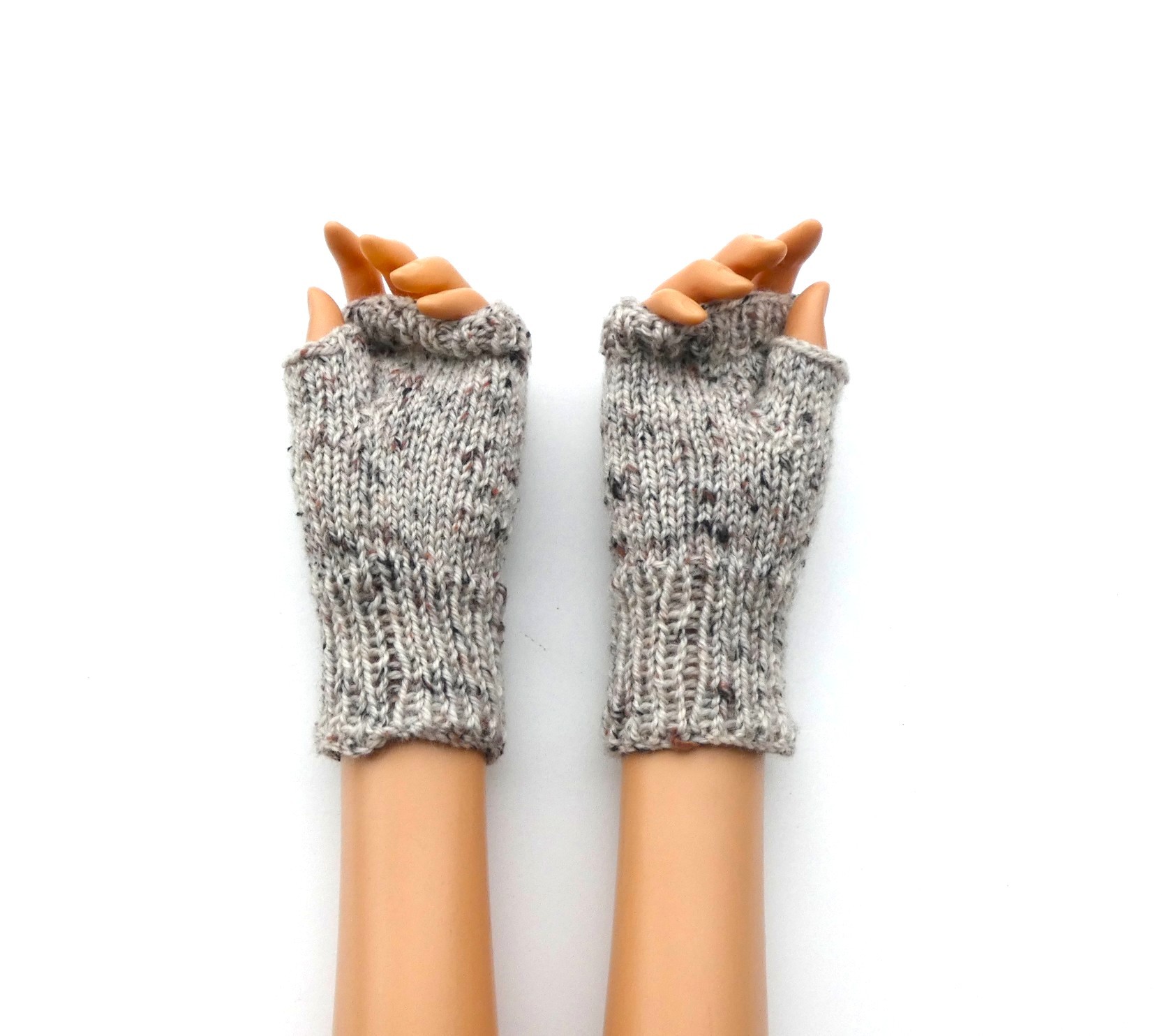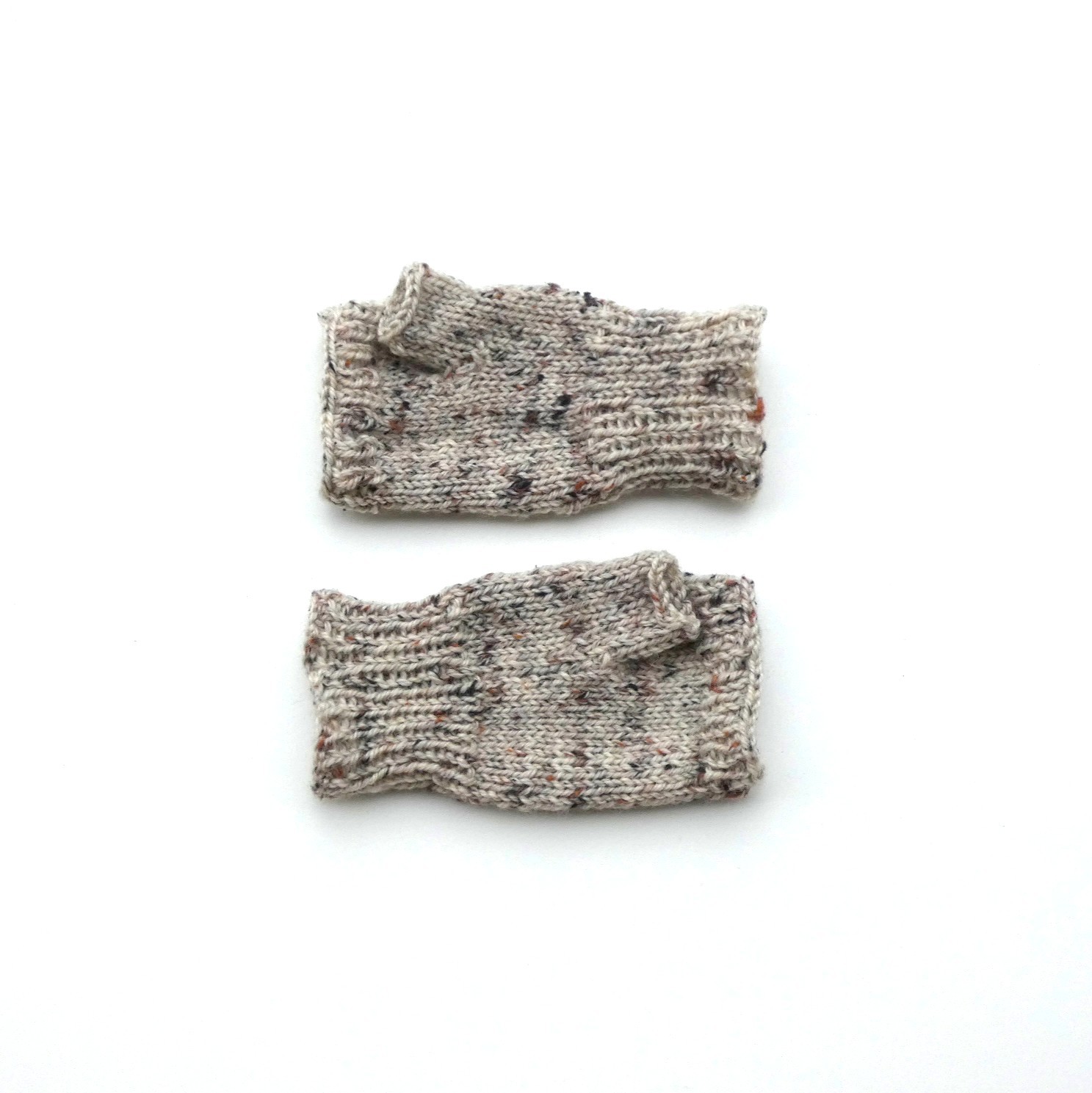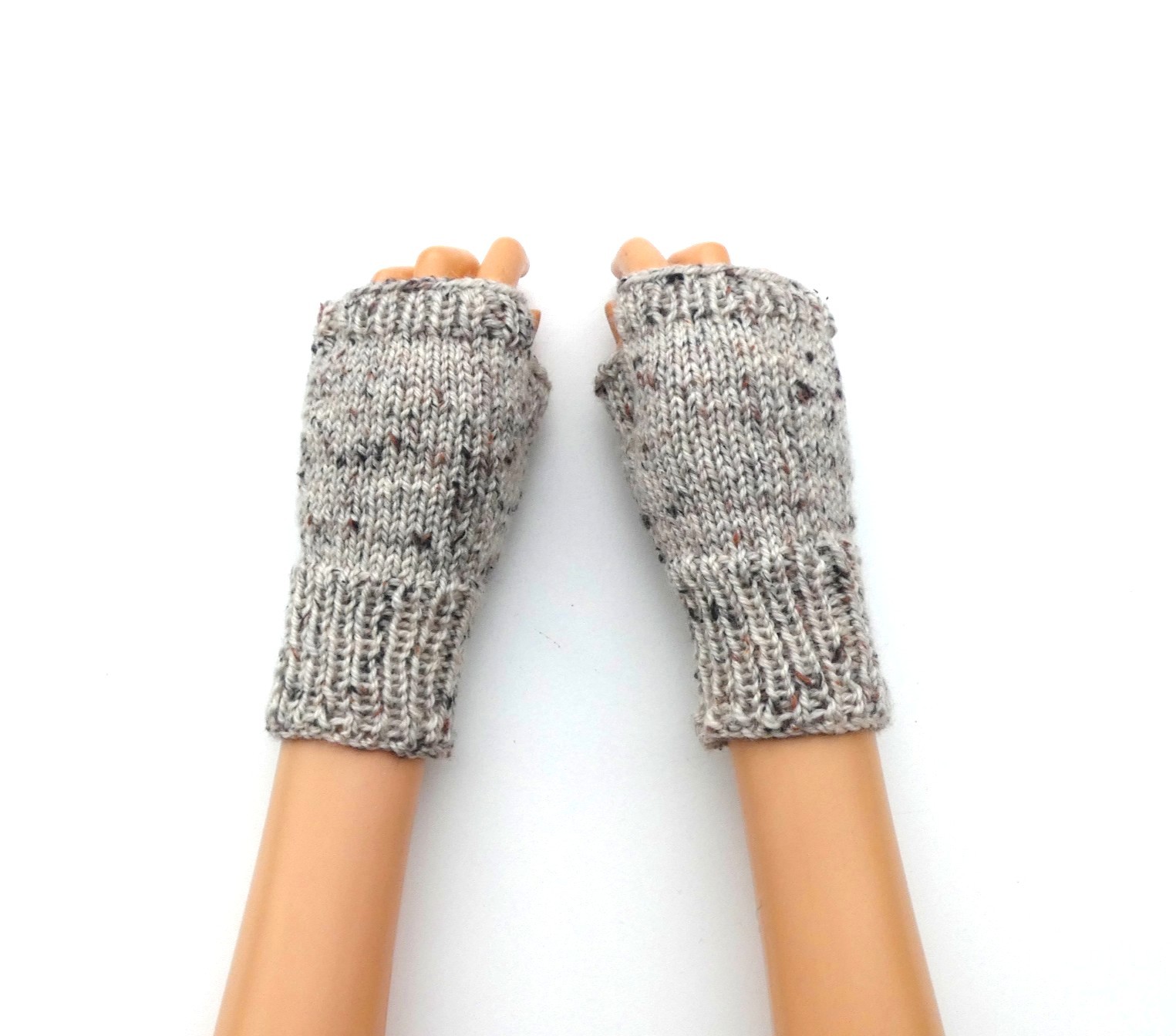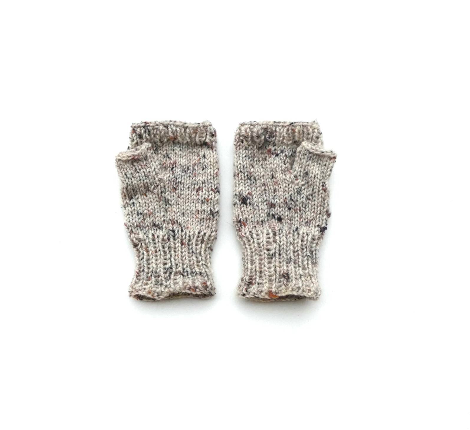 Mitaines couleur beige mouchetées de marron clair et de marron foncé .
