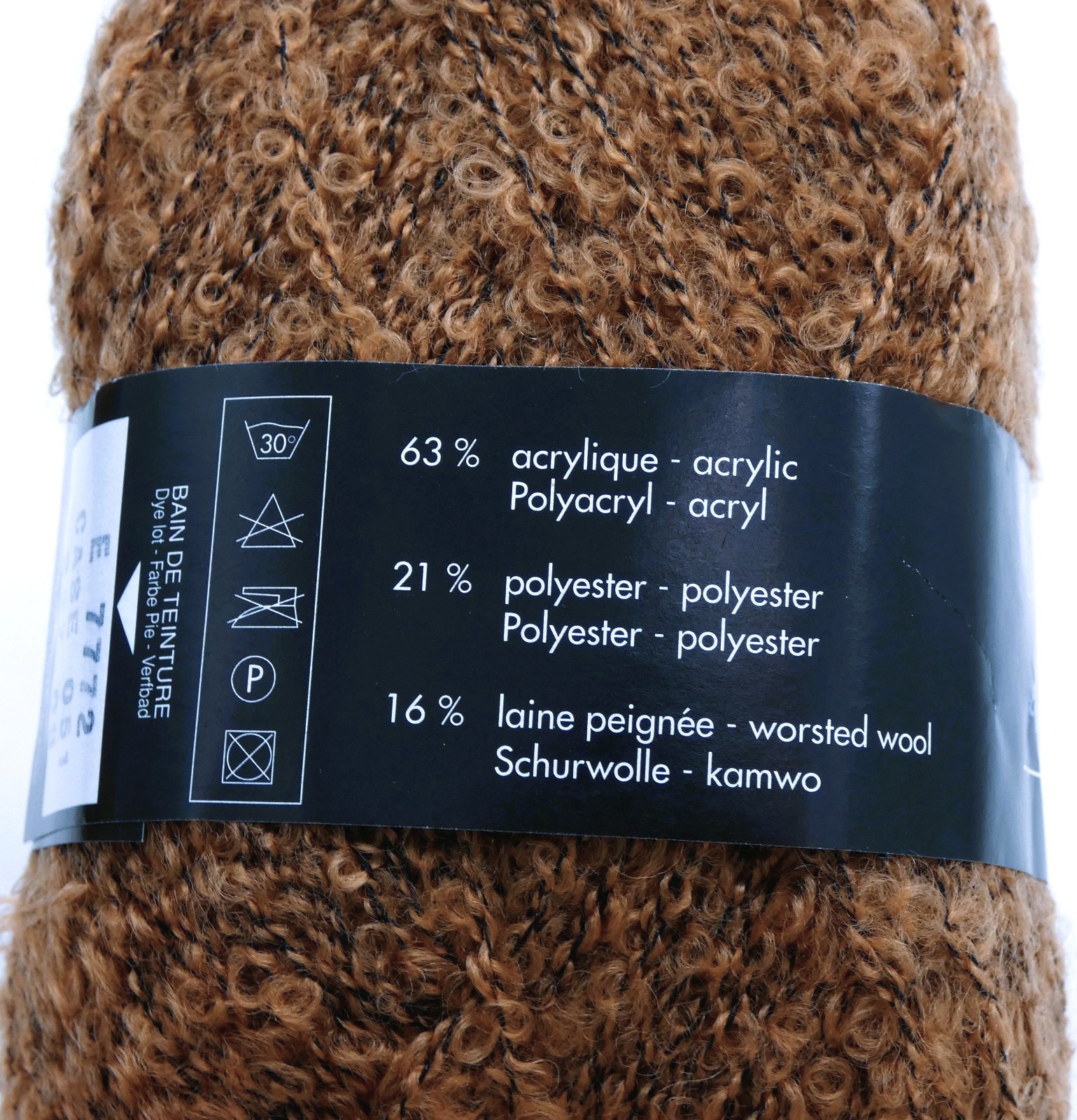 Composition : 63% acrylique, 21% polyester, 16% laine peignée.