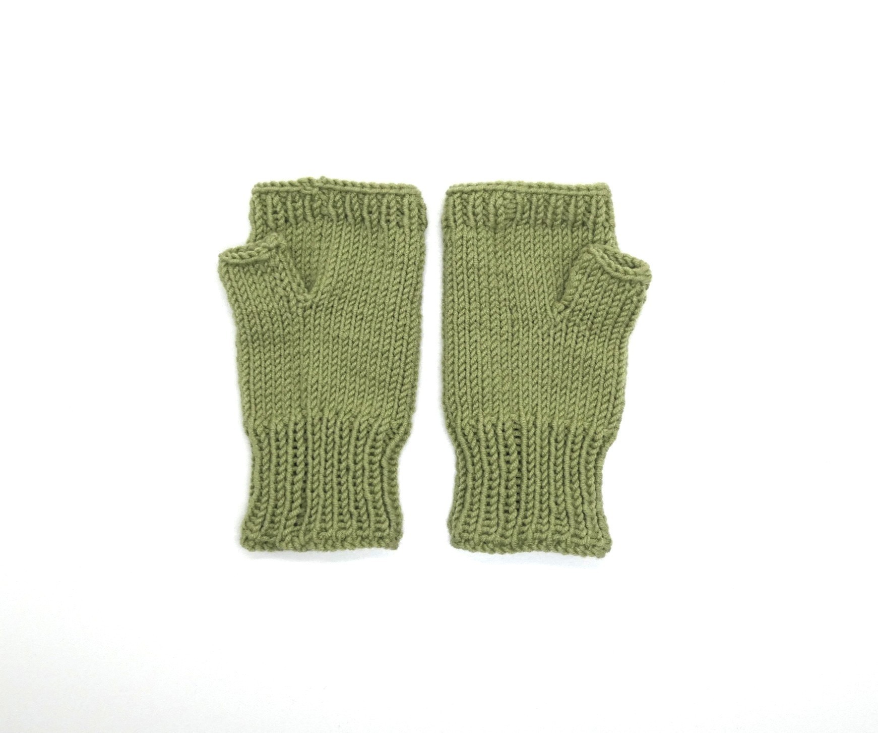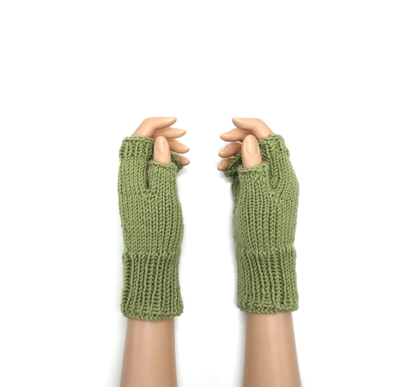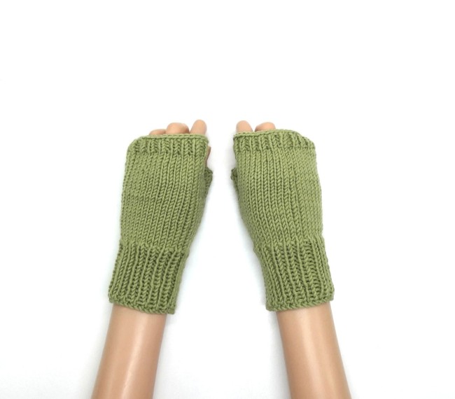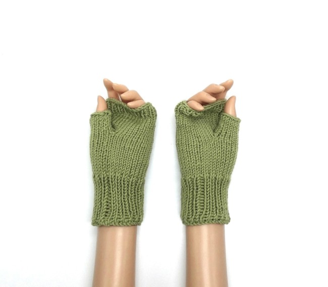 Mitaines avec pouce 100% laine merino vert entièrement tricotées main.
